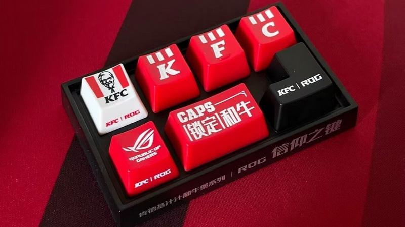 Компания KFC объединилась с Asus ROG, чтобы предложить посетителям её ресторанов возможность получить фирменные колпачки для клавиш механических геймерских клавиатур KFC x ROG. Кейкапы выполнены в фирменных цветах, набор включает семь колпачков.